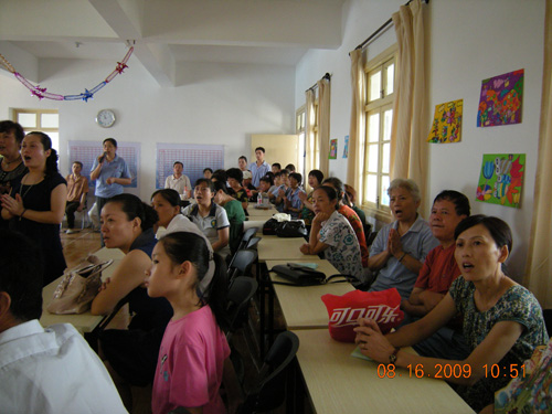 讲堂内被彩带和孩子们五彩缤纷的彩画装点的喜气洋洋。投影仪播放着引人眼球的志愿者活动照片,志愿者和亲属们、东林慈善的工作人员济济一堂,温馨而热闹。