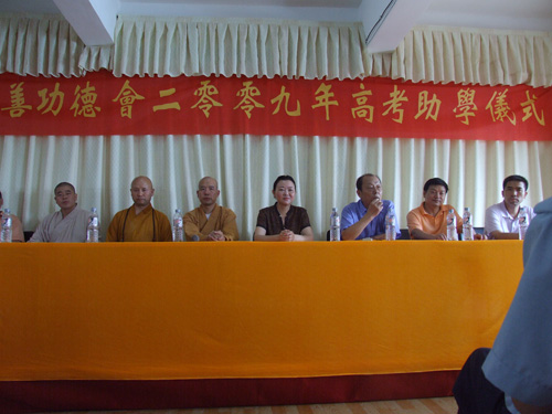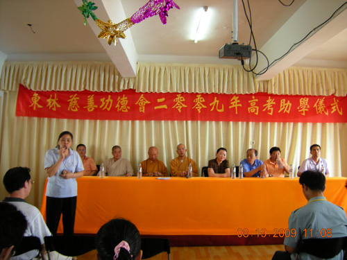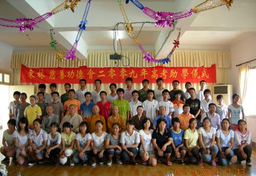 东林慈善功德会于8月19日上午,在江西省九江市总部讲堂举办了2009年度高考助学仪式。来自江西省共青一中、九江市一中、九江市庐山区一中的学生教师,济济一堂。东林慈善功德会会长镜义法师、陕西省佛协副会长大明寺方丈彻性大和尚、东林寺监院道元法师、,以及庐山区宗教局武局长、庐山区统战部杨副部长等专程出席,功德会谭敏居士主持了仪式。