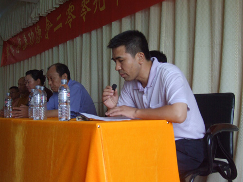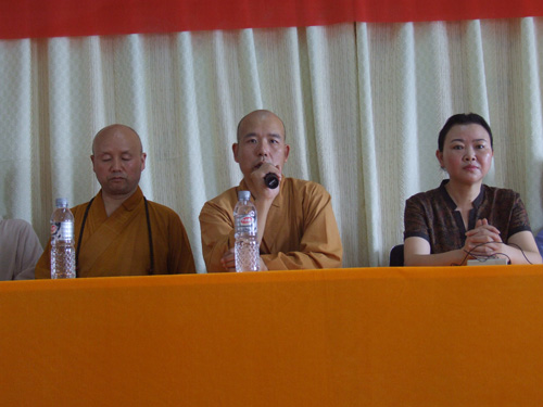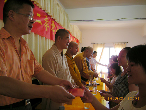 作为功德会的上级主管部门的领导,庐山区宗教局武局长最后做了发言。她指出,人生有三大喜事,其中一个就是“金榜题名时”,所以首先祝贺同学们。她说,东林慈善功德会自去年4月成立以来的一年多时间里,不管是在赈灾济贫、捐资助学,还是施医送药、修桥铺路等各方面,都为社会做出了重大的贡献。今天又在这里再次举办助学捐赠,这正是佛学思想在道德层面的体现,同时也是人间真情在我们身边的体现。我相信这种捐助能够激励同学们,我希望大家进入大学以后,能以此为激励,以乐观向上的精神、滴水石穿的毅力,脚踏实地,克服困难,更好地学习知识,学习做人,懂得感恩,回馈社会,为我们的祖国做出应有的贡献。