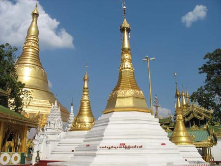 虽然建筑风格和泰国的寺庙相似,但是佛塔群的规模和华丽程度是空前的。主塔辅以82座小建筑,其雄姿在一天中任何时候都令人折服,特别是傍晚和早晨的斜阳照耀在塔上的时候,更显得金碧辉煌、流光溢彩。在这里,处处见佛,处处见虔诚的佛教徒,还有大队的当地信众,在广场上打扫和洗刷地板,很多来自缅甸各处的僧侣也聚集在大金塔下瞻仰和膜拜。