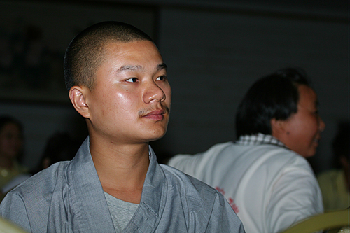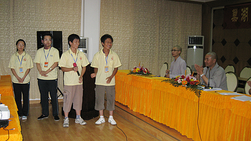见面会上,大家首先观看了,历届夏令营的图片介绍,让大家首先有了一个直观的感受,看片后,每个营员做个自我介绍,随后进行了分组,选举了各组的组长,在营长的选举中,采用以往的惯例,进行了PK,智文大和尚对4位后选人提出了3个问题,让他们各自作答:1、什么是佛?2、世界三大宗教的创始人是谁?3、佛教区别于其他宗教的根本点是什么?在经过激烈的PK后,来自中科大的硕士刘小宝营员,当选为营长。随后省佛协副会长兼秘书长智文大和尚,给大家做了开示,希望大家在这7天的营期中,能够接近佛学,了解佛学,增长智慧。见面会在晚九点结束。(