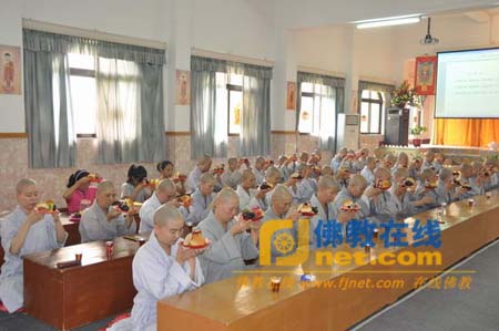2009年8月19日上午8时,广东省梅州市千佛塔寺在讲经堂举行2009年夏安居供养法会,此次法会由耀航法师主持,共有一百多位僧尼参加。大众分别在佛前供养香、花果和水,感恩三宝的加持,祈愿世界和平。