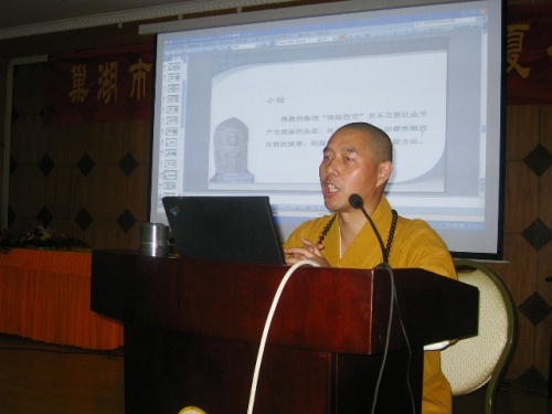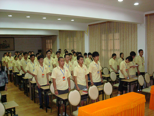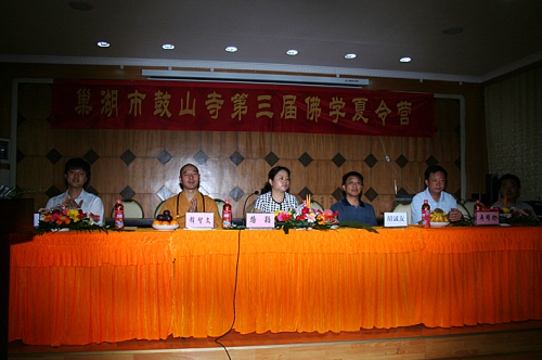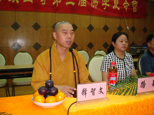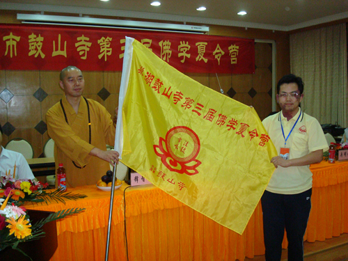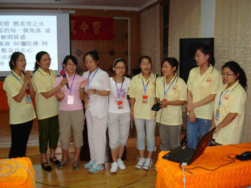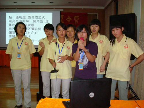 晚19时,果愿法师给大家讲解了一些礼佛、过堂的知识,随后大家进行了,佛教歌曲的学唱,在2个小时活动时间内,大家学的都很认真,中间各组还进行了PK,最后大家在叩钟偈的歌声中,结束了今天的活动。