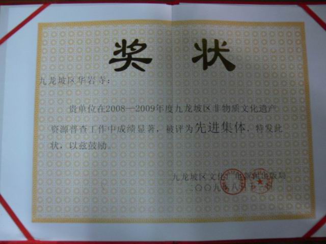 (中国佛网讯)二零零九年八月五日,重庆市九龙坡区文化广电新闻出版局授予重庆市九龙坡区华岩寺奖状,表彰重庆市华岩寺为九龙坡区非物质文化遗产资源普查工作中成绩显著,被评为先进集体。世界文化遗产保护管理属于社会公益性事业,重庆市是典型的峡江山地环境,长江从全境中横穿而过。重庆是一座具有3000年历史的文化名城,同时又是作为我国最年轻的直辖市,在历史、科学、文化和艺术价值方面均有值得研究的方面。