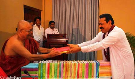 Following an ancient tradition of handing over Buddhist scriptures and books to the ruler of the land by the Buddhist clergy, the Venerable Thero handed over the translated volumes to the present day ruler, President Rajapaksa in a ceremony on Friday.