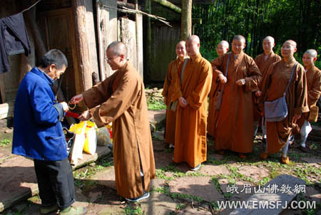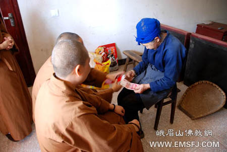 2009年9月28日上午,四川峨眉山佛学院尼众班学僧在宽祥法师、大悲法师的带领下,到峨眉山高桥镇慰问孤贫老人。
