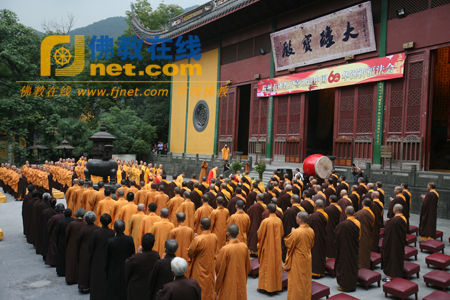 2009年9月28日上午9点许,杭州佛教界喜迎新中国60年华诞祈福法会在杭州灵隐寺大雄宝殿前隆重举行,杭州佛教界四众弟子为祖国华诞诵经祝祷。