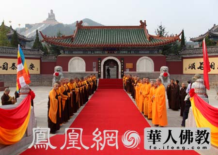 清晨六时三十分,南山禅寺鸣钟三下,诸师大众两序云集,披衣持具到山门外恭候,上明下哲方丈升座庆典法会将在此举行。寺外广场上,彩幡舞动,传达着高僧崛起的喜悦;梵音缭绕,昭示着佛教兴盛的希望。南山禅寺山门前旗幡仪仗依次排列,明哲长老在诸位大德高僧的护送下缓缓徐行。在众僧和居士的迎请下,明哲长老缓步进入山门、天王殿、大雄宝殿、圆通殿礼拜说偈,各项晋院事宜一一如法进行。晋院仪式结束后,明哲长老在僧人信众的簇拥下,从禅寺法堂东门经南山大佛广场行至南山大佛座下万佛殿。万佛殿法堂内,灯烛摇影,芳香四溢,诸山长老、两序大众、领导嘉宾在此静候。明哲长老手持如意,在仪仗队和侍者的引导下行至法堂说偈礼拜,诸山长老为明哲长老送座。按方丈升座仪轨,明哲长老在维那师的炉香赞中,拈香礼佛说法演教,登法王座。至此,明哲长老正式成为南山禅寺第二任执行法务的方丈。
