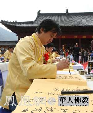 华人佛教山西讯:2009年9月26日上午9点,山西五台山普寿寺大雄宝殿前,在凤凰卫视著名主持人李辉的宣告下,“中国千名书家千卷写经作品开光仪式”正式开启。