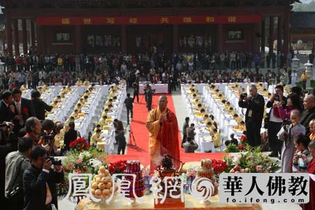 佛乐声中,千名僧尼同颂《心经》,统一着装的百位书法家焚香、沐手,同书《心经》。完成后,百名书法家们手捧作品,走上大殿,与千名僧尼组成一幅宏大庄严的画卷。