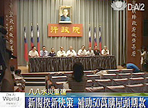 台湾行政院在13日召开第四度八八水灾重建推动委员会会议,由新上任阁揆吴敦义、副阁揆朱立伦亲自主持,公布最新决策。同时请来参与重建的各个慈善团体,包括:红十字会、慈济以及企业代表,一起讨论重建方案。