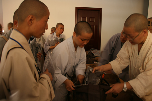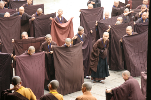 自八月初一封坛以来,慈云佛学院传戒法会由开堂大师父养戒法师及引礼师父们不辞艰劳传授新戒子威仪行门,背诵早晚功课,教唱梵呗,忏魔,由于人数众多,昨天还顶着小雨在广场上给新戒子门教穿袍搭衣、展具等生活细节。对于一个出家人,其中威仪行门犹如盖楼之地基,能体现出修道之人不放逸行仪。