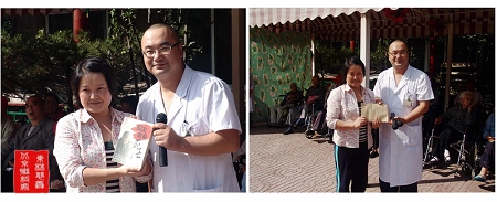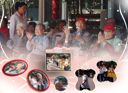 9月13日下午两点半,在松堂关怀医院朱院长亲自主持下,活动正式拉开了帷幕。活动开始,东林慈善北京的志愿者们为所有的老人送上了一曲《燃灯之歌》——感念老师们如一盏盏的明灯,燃烧了毕生的青春,照亮着他的学生,远离迷惘,解开疑惑,祝愿老师们能每天欢喜、自在,颐养天年。接着,歌曲串烧、《送别》、《让我们荡起双桨》、吉他表演、武术……一个个节目精彩纷呈。在《感恩的心》手语舞上,东林慈善的志愿者和正心堂的同仁们紧紧握住了双手,大家纷纷向老人、向在座的教师鞠躬,一声声阿弥陀佛,道尽了学生们的感恩之心。在浓浓的欢乐气氛中,老人们也按捺不住了,和志愿者们一起同台演出。爷爷奶奶有的跳舞、有的唱起了戏剧、有的朗诵诗词,一派其乐融融。在志愿者纷纷登台献艺的同时,志愿者还为住院的老师准备了一个甜美的蛋糕,祝福老师们节日快乐。还有正义堂同仁为老人准备的可口水果。为了适合老人食用,正心堂的同仁们事先将水果切成了小块。在老人欣赏表演的同时,大家齐动手,用手为老人喂食。最后,活动在正心堂负责人、超越轮回总导演赵丁居士的带领下,老人们兴致勃勃和所有的爱心人士一起,学习手语《我们是一家人》,用大家的手画出一个个的爱心小屋。这爱心的小屋,正是我们大家共同的家。