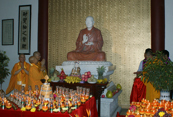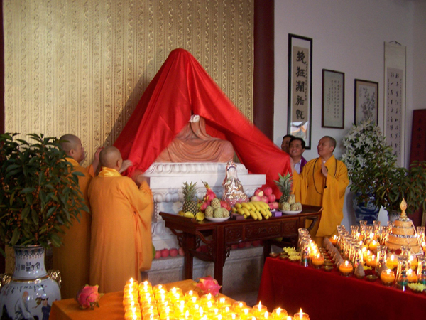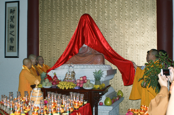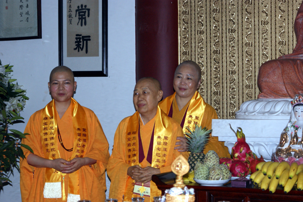 中国佛教协会副会长、四川省佛教协会会长永寿法师,台湾中华比丘尼协进会理事长明宗法师,台湾中华比丘尼协进会秘书长见引法师,和四川尼众佛学院院长如意法师,以及四川省宗教局王局长、彭州市政协主席刘汉元先生为隆莲老法师法像揭幕。