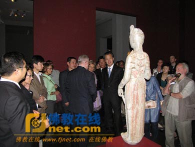 2009年9月17日,山东青州佛教造像展在法国巴黎赛努奇博物馆开幕。中国驻法国大使孔泉、驻法使馆文化公参蒲通和巴黎市主管文物遗产的副市长普尔托女士在山东省文物局副局长王永波和赛努奇博物馆馆长吉尔·贝干的陪同下观看了展品。
