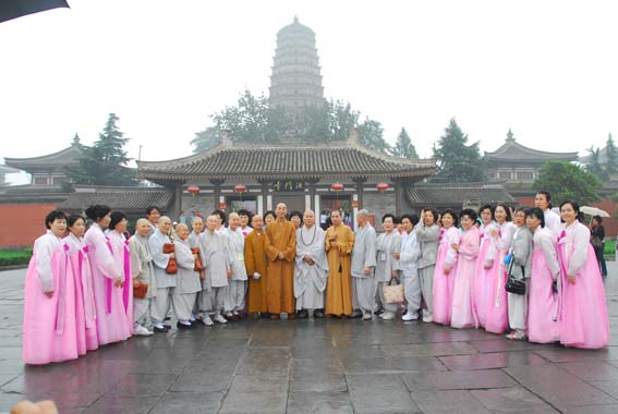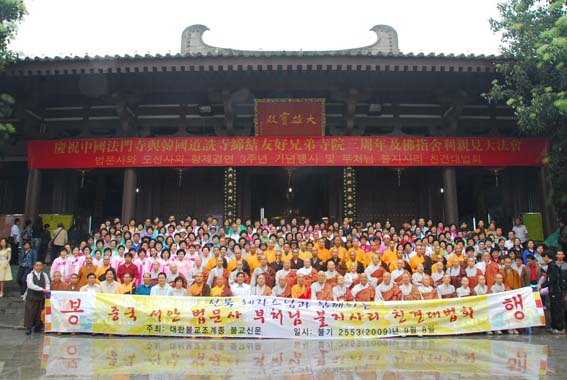 2009年9月8日上午10:10分,与法门寺缔结为兄弟寺院的大韩佛教曹溪宗道诜寺和大韩佛教曹溪宗佛教新闻社主办的“禅默慧慈法师为首、中國陕西法门寺佛指舍利圣地朝礼团”一行250人(其中韩国法师30位,信徒220人)参访法门寺,受到以法门寺监院智超法师为首的僧俗二众的热情欢迎!