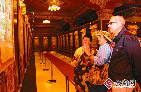 2009年9月5日,记者走进云南迪庆藏族自治州香格里拉坛城广博中心,只见众多来自国内外的游客在认真欣赏精美的唐卡画,一幅幅唐卡画向世人展示着一个个精彩的藏族传统文化故事。