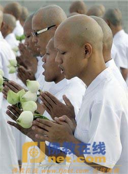 2009年8月29日,泰国巴吞他尼府法身寺举行剃度大典,逾七千名来自泰国各地的男子剃度为僧侣。这些新僧侣将在法身寺内进行修持,直到10月4日佛教徒的斋戒结束。(图:美联社)