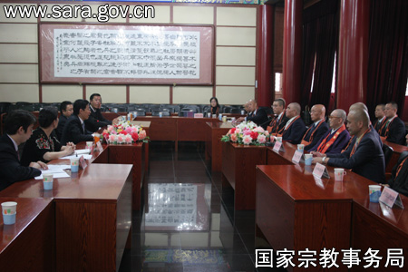 蒋副局长高度赞扬了日中友好宗教者恳话会、日本真言宗对促进中日佛教友好交流所做的贡献,并表示国家宗教事务局将一如既往地支持中国佛教协会与日本佛教界的友好交往。小野(土冢)几澄长老及代表团团长高梨坚堂长老简要介绍了此次访华团的一些情况,对国家宗教事务局、中国佛教协会一贯的支持表示诚挚的感谢,并表达了对中国佛教协会已故赵朴初会长的敬意。