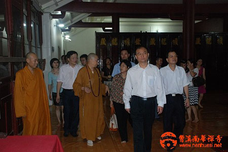 随后,在传正法师的陪同下,齐晓飞副局长一行参观了六祖惠能大师、憨山大师、丹田大师三尊真身像,齐晓飞副局长对南华禅寺能保有如此高档次的真身十分赞叹,接着,齐晓飞副局长一行又参观了南华禅寺藏经阁,传正法师向领导们详细介绍了藏经阁中所藏珍品的历史价值,齐晓飞副局长对藏经阁的文物给予了高度的评价和肯定。参观了藏经阁后,齐晓飞一行到大雄宝殿参观开光的大殿五百罗汉像,并到禅宗书画展厅、南华禅寺档案室、网络信息部及曹溪佛学院进行实地考察。