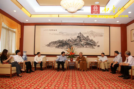 南普陀寺方丈则悟法师、监院界象法师在普照楼会客厅热情接待了代表团一行,双方并进行了座谈。