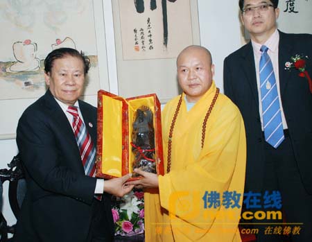 见忍方丈向泰国前科技部长Pravich(左)赠送双面观音