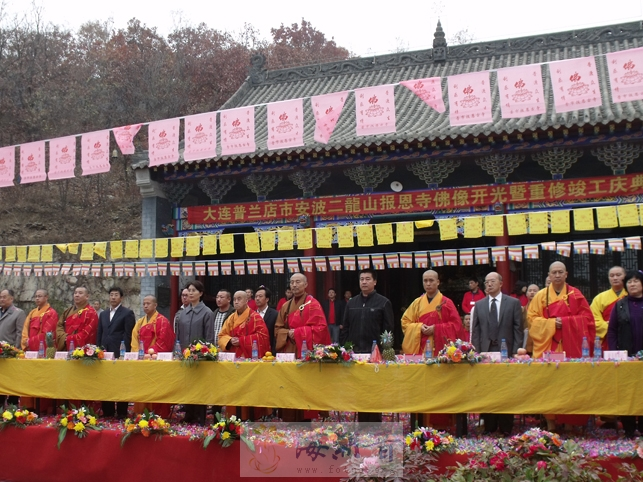 2009年10月28日,辽宁省大连市普兰店市安波二龙山报恩寺举行佛像开光暨重修落成庆典法会。大连市宗教局周晓林副局长、李辉处长,普兰店市宗教局连丕满局长,楞严寺法主圆山长老、辽宁省佛教协会会长照元法师、副会长性妙法师、大连市佛教协会副会长义辉法师、愿西法师等出席了法会。