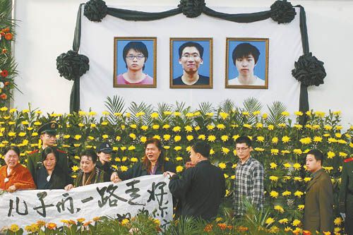 10月28日,荆州市民在追悼会上献上写有“儿子们,一路走好”的条幅。当日,湖北省荆州市委、市政府和长江大学举行隆重的追悼会,悼念为抢救落水儿童而牺牲的陈及时、何东旭、方招3位大学生。数千名社会各界人士自发前往悼念,表达对逝去英雄的深深怀念和敬意。中共中央政治局委员、国务委员刘延东和湖北省委、省政府负责同志送来花圈,并致电慰问英雄家属。