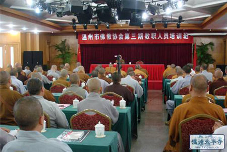 2009年9月29日,浙江省温州市佛教协会在金鹏宾馆开展了第三期教职人员培训。会议由江心寺智明法师,妙果寺达照法师、常德法师,温州市太平寺万如法师主持。天童寺诚信法师,西园寺济群法师,浙江省民宗委处长周永辉,温州市民宗局局长王宁主讲。温州地区各寺院负责人共200余人参加了此次培训。
