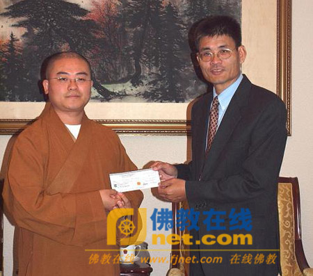 法隆法师将救灾支票交与中国驻加使馆公使衔参赞杨优明