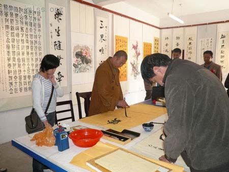 “迎国庆60周年佛教书画精品展”由沈忠道宣布正式开始,王立中、徐有虎等领导及武威书法家郭怀发先后发表了讲话,对鸠摩罗什寺举办的迎国庆60周年佛教书画精品展给与了极高的评价,认为这是创建和谐寺观教堂的有力举动。