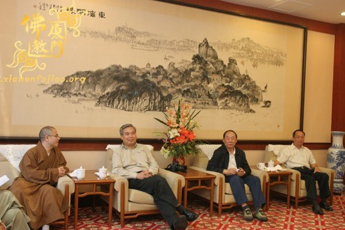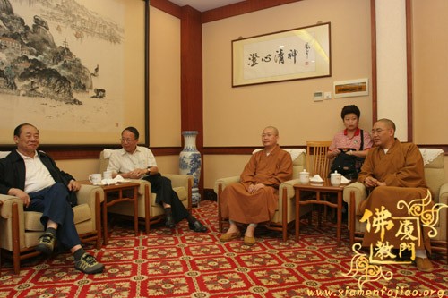昨天下午4时50分,全国政协委员、民宗委副主席仲兆隆,全国政协委员、民宗委驻会副主任邓宗良等一行14人考察团在福建省政协民宗委副主任邹瑞金等的陪同下到厦门南普陀寺考察,并在南普陀普照楼座谈交流。厦门市政协副主席陈耀中,市政协副秘书长陈保国,市政协社法委副处长王秀玉,市民宗局蔡永华副局长,沈仲勇处长,市佛协副会长、南普陀寺监院界象法师,市佛协驻会副会长法云法师,南普陀寺大知客法尊法师,市佛协副秘书长、南普陀实业社主任曾全民等热情接待了考察团一行。