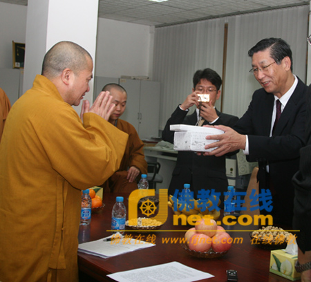木村宣彰法师向中国佛学院赠送礼品,广如法师代表中国佛学院接受。