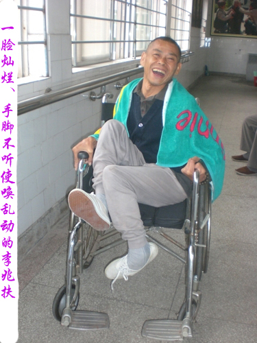2009年10月12日,在东林慈善安养院三楼走廊里,看到一个坐在轮椅里的残疾人,他一脸灿烂的笑吸引了我。我麻烦蔡师兄找出了他的入院资料:李兆扶,九江新塘乡铜泉村7组。脑炎后遗症导致瘫痪。每月靠150元低保金生活。10月7日接入安养院。我们的话题由此开始……