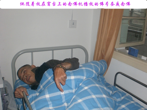 他说:原先没有信仰,来安养院后才念佛。因为东林慈善安养院给予他天堂般的生活,因为黄卓鹏师兄给他讲明白了因果道理。在安养院,他体味到世间罕有的不要任何回报的大善。由于长时间身体亏耗,短短的几天,他因为贫血已经在安养院晕倒了两次。他说要老实念佛,病彻底好是不可能的,但是可以最大限度的缓解痛苦,他感觉念佛身体很舒服。