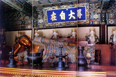 卧佛殿是全寺的精华。殿内有一尊巨大的铜卧佛。佛身长一点六丈,重约五十四吨,作卧睡状,侧身躺在高榻上,双腿直伸,左手平放在腿上,右手托着头,体态自然,相传这是释迦牟尼在印度涅盘时的姿势。旁边站着十二尊泥塑小佛像,表示向他的弟子嘱咐后事的情景。这尊铜像为元代(十四世纪)所造,是中国古代的宗教艺术珍品。在三世佛殿的前面,有一株古老的娑罗树,据说是从印度移植来的,是佛国三宝树之一,象征释迦牟尼涅盘于娑罗树下。