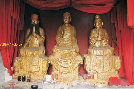 左侧为道教创始人老子,正中为佛教创始人释迦牟尼,右侧为儒家创始人孔子。