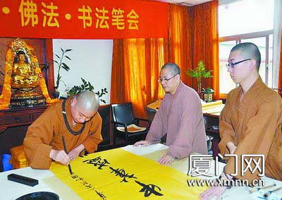 10月4日上午,由南普陀寺与厦门书法家协会联合举办的“迎国庆佛法·书法笔会”在南普陀寺举行,则悟大和尚、市书法家协会主席陈秀卿、台湾女书法家吴清菊等多位书法家挥毫留下了“中华盛世”、“圆融无碍”、“海峡西岸正春风 佛门圣地喜相逢”等墨宝。