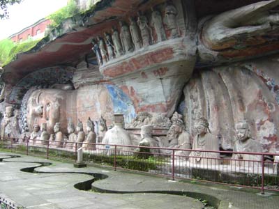 四川大足县宝顶山大佛湾的千手观音世界闻名。在十丈见方的岩壁上,雕刻的三米多高的观音坐像,从身后不同的角度、不同的方位参差不齐、错落有致地伸展出一千多只手臂,每只手心有一只眼,执一样法器,百态千姿,无一雷同,庞大自然,恍若天生;金碧辉煌,令人惊叹,堪称世界雕刻史上的一大奇观。