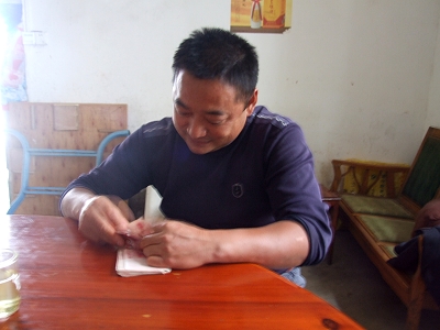 七月份的天气十分炎热,帐篷内的温度似蒸笼一般。两个儿子一个在读大三,一个在读大二,钟财香不知道如何面对今后的生活。政府尽管作出了很多努力,还是不能解决她的家庭困境,九月份我们进行最后核实的时候,才知道她的胸口有一个拳头大小的瘤子,因为没有钱不敢去医院治疗。师父当即决定资助她三万元,帮助她建造房屋。送钱到她家和她签建房协议的时候,她一直忙着找好吃的给我们吃,找来找去找不到,只好端出水来给我们喝。