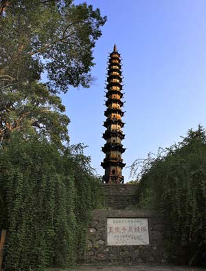 玉泉铁塔,始建于北宋嘉祐六年(公元1061年),由玉泉寺僧务本禅师领工铸建,它是我国目前最高、最重(十万六千六百斤)和保存最完整的铁塔。铁塔每层每边铸有“八仙过海”、“二龙戏珠”和海山、海藻、水波等文饰,线条清晰、流畅,台座八面,各铸托塔力士一尊,脚踏仙山,头顶塔座,体态刚健;塔角飞檐,凌空龙头,悬挂风铎;逐层迭装,不加焊接,稳健玲珑;日照塔身,紫气金棱,交相辉映,故曰“棱金铁塔”。塔身还铸有2373尊小佛像,形态逼真,栩栩如生。
