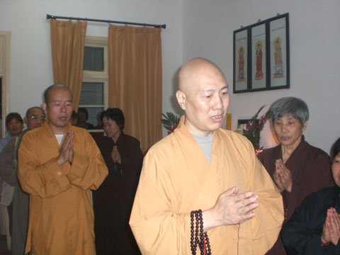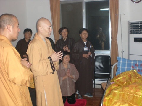 法师慈悲无限,到已往生的梦桥居士遗体前,和众居士一起助念并做开示。