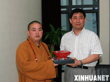 永信法师接受上海世博局局长洪浩赠送的上海世博会中国馆模型