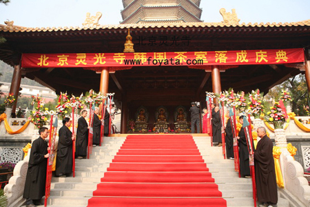 2009年10月29日上午,北京市灵光寺隆重举行韩国佛教天台宗捐建的“韩国茶室”落成庆典法会。国家宗教事务局蒋坚永副局长,中国佛教协会张琳副秘书长,灵光寺方丈常藏法师,韩国天台宗总务院长朱正山长老及僧众护法、韩国驻华使馆工作人员150余人参加了庆典。法会由中国佛教协会国际部副主任普正法师翻译并主持。