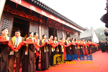 大慈恩寺监院传相法师为大家介绍了大慈恩寺大雄宝殿的重建经过,对为大殿重建工作给予支持帮助的各级领导、各界人士表示衷心感谢,随后,与会嘉宾共同为大雄宝殿落成剪彩,最后举行大雄宝殿内佛像开光法会,诸山长老共同主法开光。