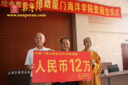 近日,福建省厦门市慈善总会常务副会长杨昌明与厦门市南普陀寺慈善会代表一行来到厦门市翔安区海洋职业技术学院,参加了“2009年度厦门市慈善总会、厦门市南普陀寺慈善会捐助厦门市海洋职业技术学院贫困生仪式”。厦门市慈善总会与南普陀寺慈善会资助了该院120名贫困大学生,共发放助学金12万元。