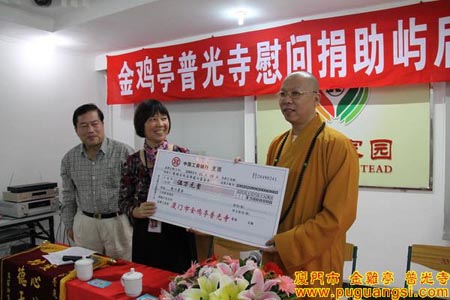 2009年11月16日,福建省厦门市金鸡亭普光寺慰问捐助思明区屿后西社区仪式隆重举行。厦门市统战部副部长、民宗局党组书记陈建德,厦门市思明区民政局张泽夫局长,厦门市思明区筼筜街道工作委员会蔡乾坤书记等领导出席了捐赠仪式。