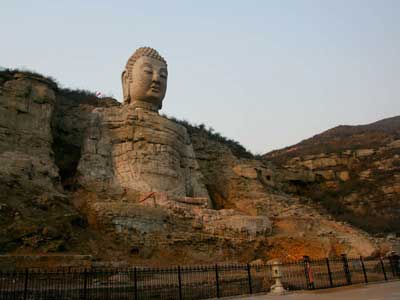 蒙山大佛位于山西省太原市西南约20公里处,属太原市晋源区管辖。蒙山大佛始凿于北齐高洋帝天保二年(551),距今已有1400多年,其开凿时间比四川乐山大佛早162年,可谓历史久远;蒙山大佛凿刻时,“夜则以火照作,寒则以汤为泥”,费时25载,佛像高63米,比以往西方所说“世界第一大佛”阿富汗巴米扬大佛高10米,可谓规模宏伟,堪称天下第一佛。