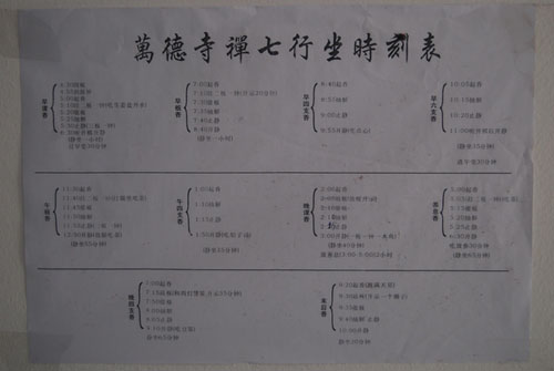 夏尽冬至,小寒初降。农历十月初二,对万德寺来说,是个令人兴奋的特殊日子。当天,就要结制起七了。寺院里到处贴著红纸条,如“念佛是谁”、“照顾话头”、“勇猛精进”、“渐入佳境”等,空气中弥漫著浓浓的喜气。万德寺以“冬参夏学”为宗旨,农禅并重。整个夏天,师父们都出坡劳动,培福培慧,终于等到了今天,大冶洪炉乍开,正是考核自己一年行道的结果,希望能在七期里克期取证,解决自己的生死大事,跳出三界轮回的苦海,获得永恒的清净与自在。