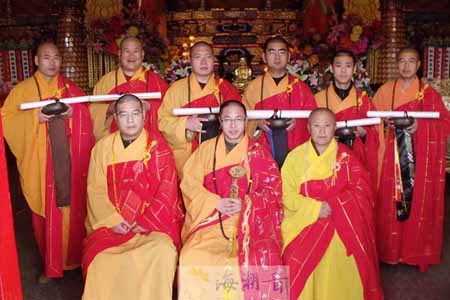 佛家在线辽宁讯 2009年11月11日上午,辽宁省大连市营城子永兴寺隆重举行了天台宗传法大典。四十六世天台宗法脉传人明心法师将天台宗法脉传予照心法师、果智法师、妙法法师、隆彬法师、照观法师、照寂法师六位禅人,成为天台宗的第四十七世法嗣。(图/文:虚实居士)